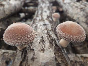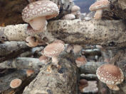 初期に植菌した原木の小口からは椎茸菌が白く噴き出していています。