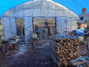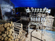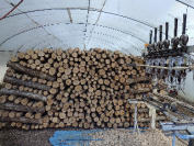 遂に、9号ハウス内の穴あけ原木に種菌打ち込み終わりまして、9号ハウス外のブルーシートの屋根が張られた外での作業に移りました。