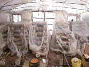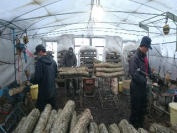 そんな中、6号ハウスで原木に打ちこんだ種菌が凍ってしまわないようにビニールを被せて保温しています。