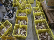 画像左側は選果場で収穫されたカゴに入った椎茸の選別待ち画像です。これはほんの一部で、これの何倍も収穫されています(^^;)