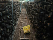 今日、5号ハウスに行くと、数日前に積んだ榾木が中間から折れて崩れていました。