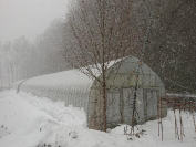 そんな中、ハウス作業中の内部は屋根に降り積もった雪の影響で薄暗くなっています。
