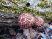 初期に植菌した原木の小口からは椎茸菌が白く噴き出していています。