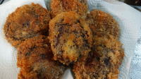 1 フライパンに、しいたけが浸かる位のサラダ油を入れて180度で過熱します。 2 しいたけを軽く洗い軸を取り、小麦粉をまぶしてから溶き卵に入れます。 3 パン粉を付けてから180度に熱せられた油で揚げます。均一に熱が通る様にひっくり返します。 4 きつね色に成ったら油を切って出来上がり。